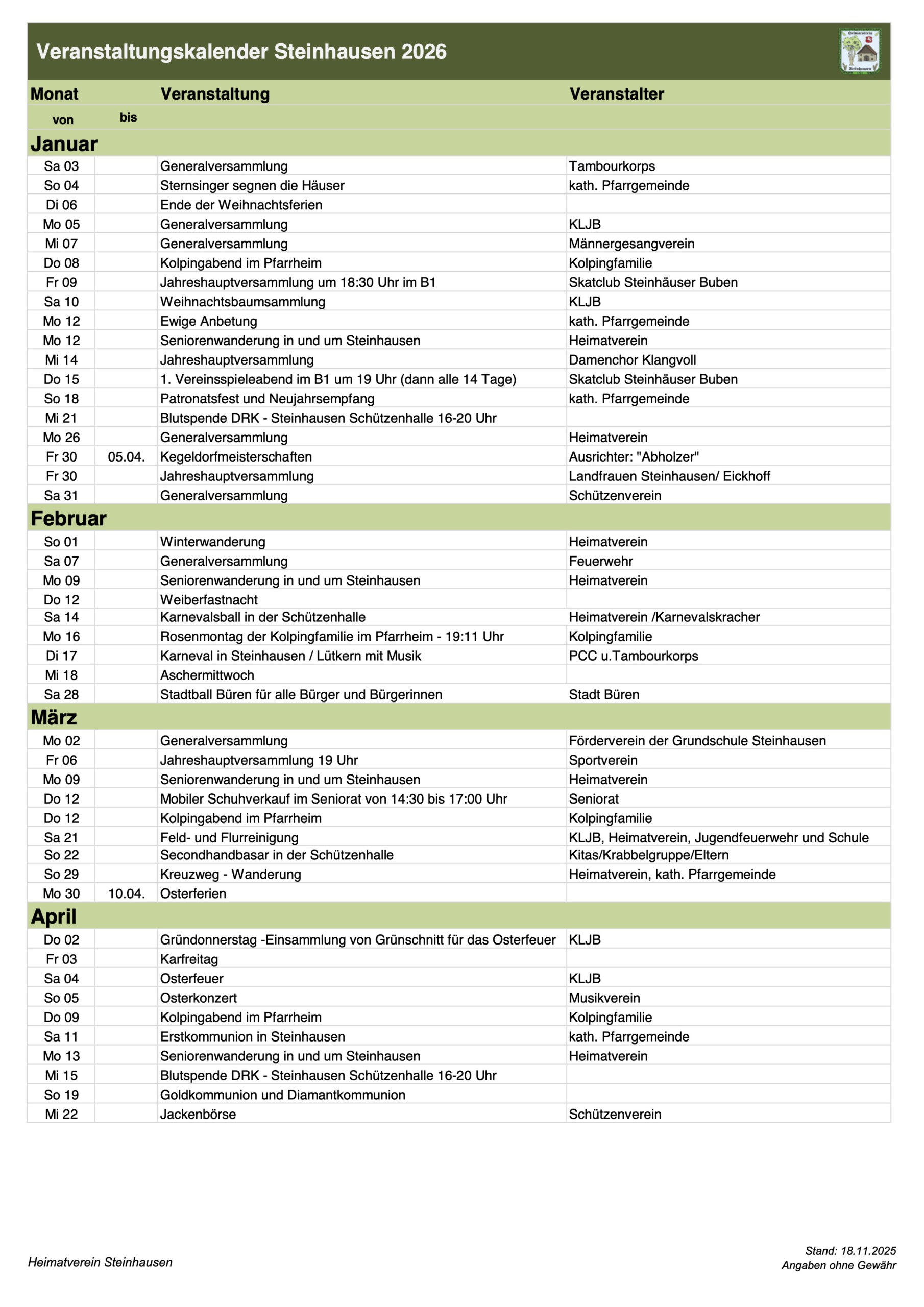 Es kann im Laufe des Jahres zu Terminänderungen und Absagen kommen.
